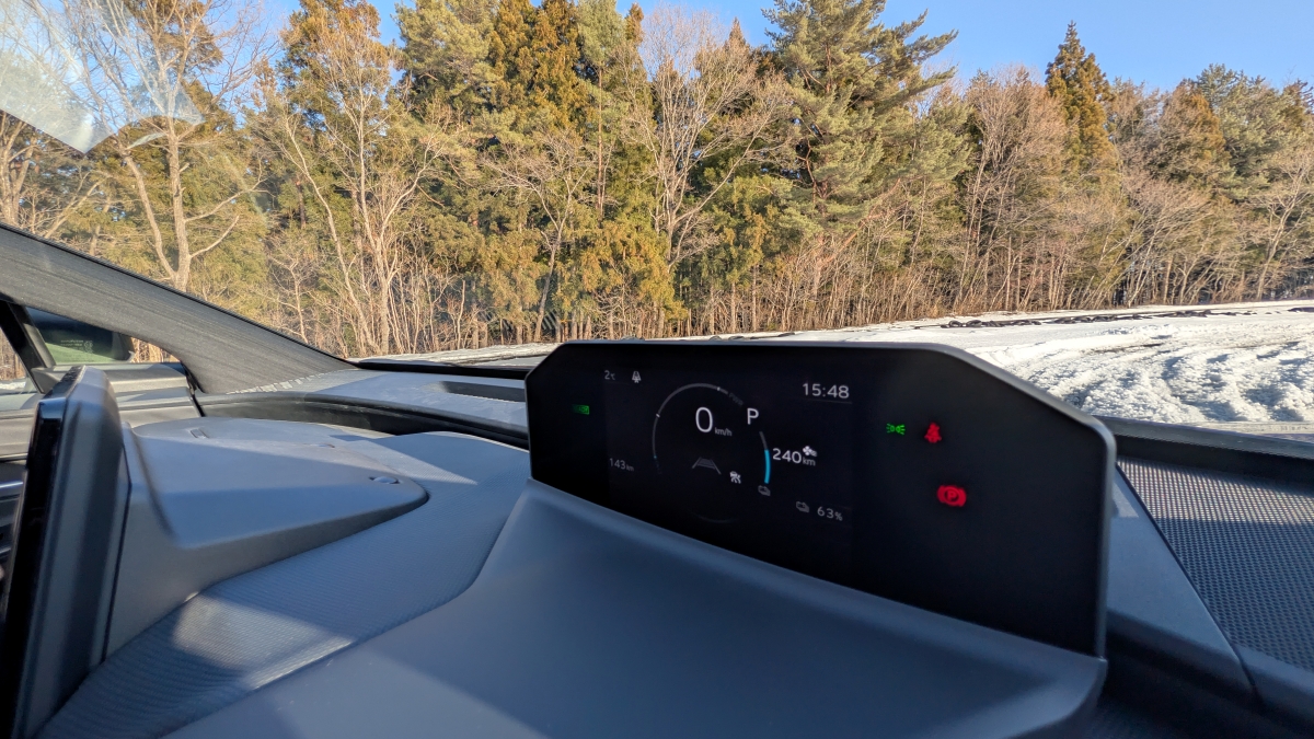 総電力量74.7kWhのリチウムイオンバッテリーを搭載していて、一充電走行距離はFWDが734km、AWDが690km、20インチ装着車で627km(それぞれWLTCモード)と発表されている。日産「サクラ」と「リーフ」のオーナーでもある西沢は、現実的なEVの航続距離として、カタログ値に0.75の係数をかけることにしている。それで現実的な航続距離になるのだが、そうすると……734㎞→550㎞と627㎞→517㎞となる。まあこんなもんでしょ。ということで、航続距離を優先するならFWD、悪路や降雪地での安心感を重視するならAWDという選び方ができるわけだ……が、そのAWDでの雪道走行が凄かったのだ。