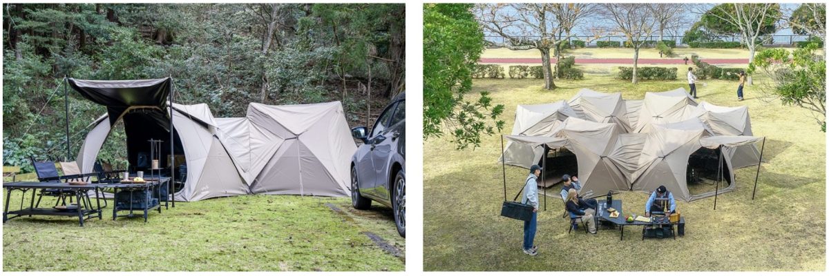 さらに、連結して拡張できる「ヘキサ型キャンプシェード用トンネル」をはじめ、シートやラグ、ポップアップシェード、ダブルマットなどの関連ギアも同時発売となった。