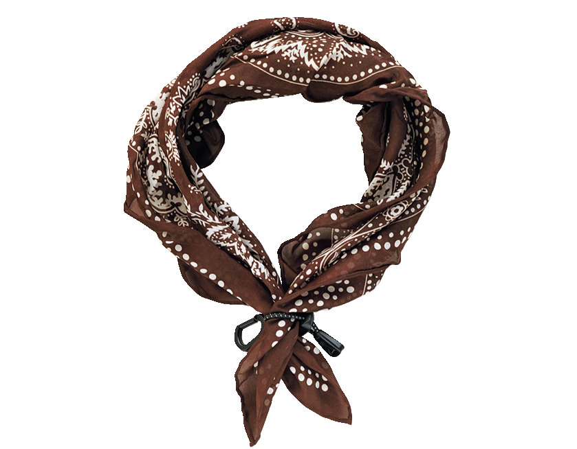 これの小さなものを使った「ダングルコード」という道具があります。バンダナやスカーフ、手拭いをズボンのベルト通しに引っかけたり、バッグにぶら下げたり(Dangleはぶら下げるの意味)できます。カラビナはPOM樹脂という歯車やベアリングなど機械部品に使われる弾性、耐衝撃性があるエンジニアリングプラスチックで、チタンより軽い素材。ゴムコードを使用しコードストッパーがあるので、薄い手拭いから厚めのタオル、それにスカーフを結んだりしなくても、これに突っ込んでロックすれば落ちません。