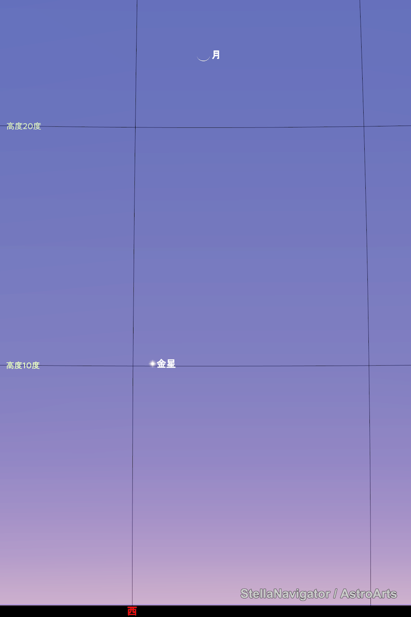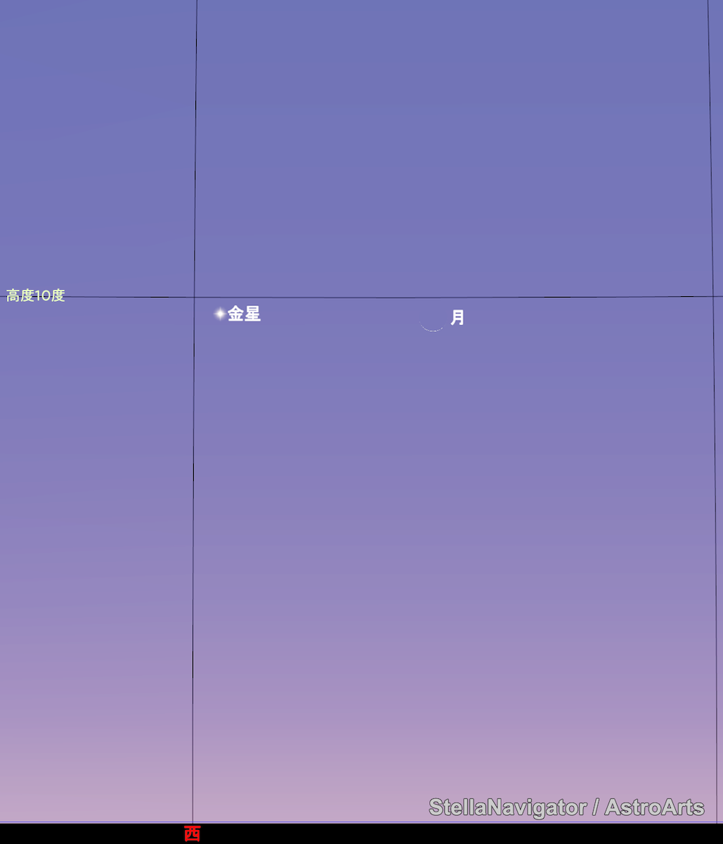 金星を目印に、その西側を探っていきましょう。双眼鏡の視野に金星と月が収まります。日没後30分くらいが狙い目です。