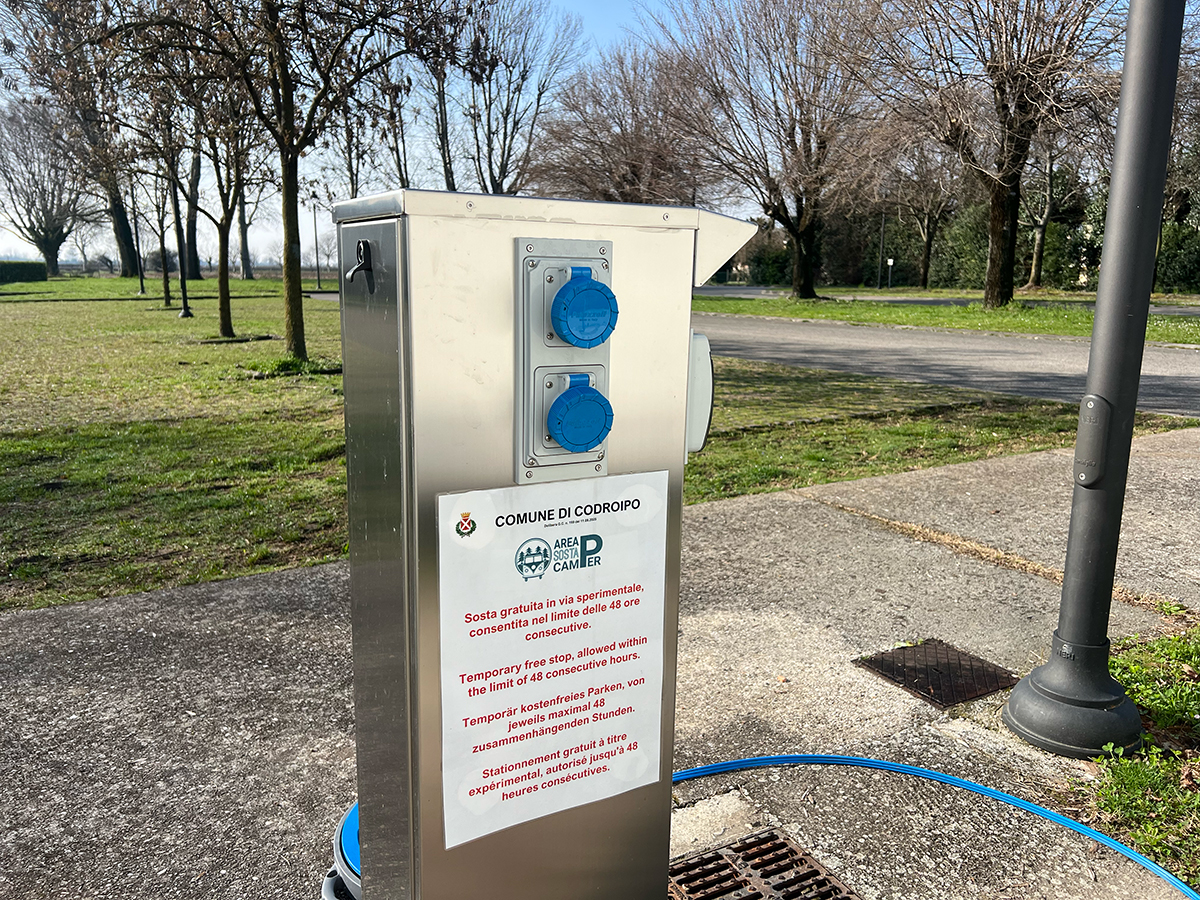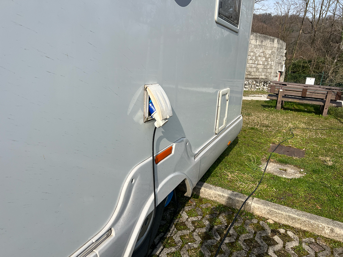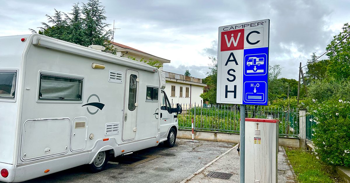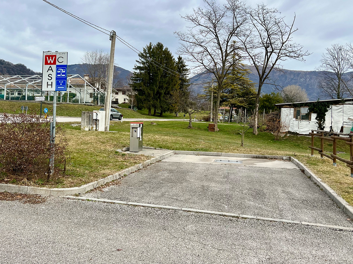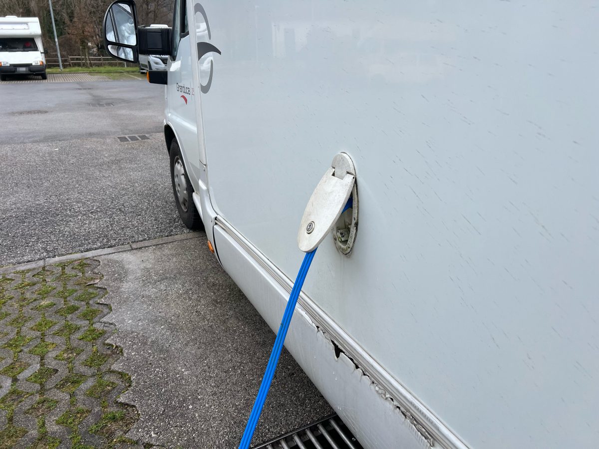 RVパークの一角には給水場が設けられており、排水設備とセットになっていることもよくあります。給水は無料の場所が多いですが、中にはコイン式になっているところもあります。有料の場合は、1ユーロで約100L前後の水が使えるケースがよく見られます。