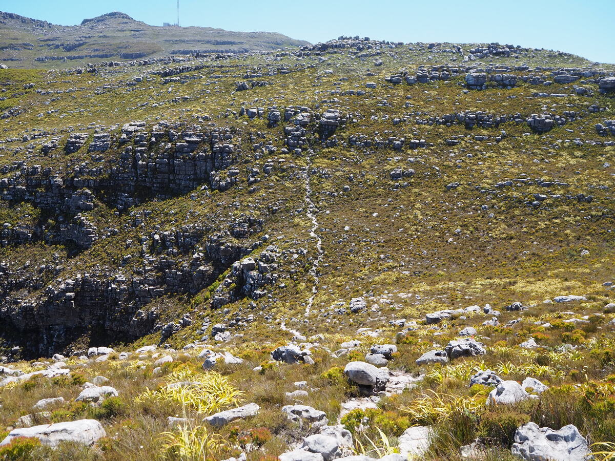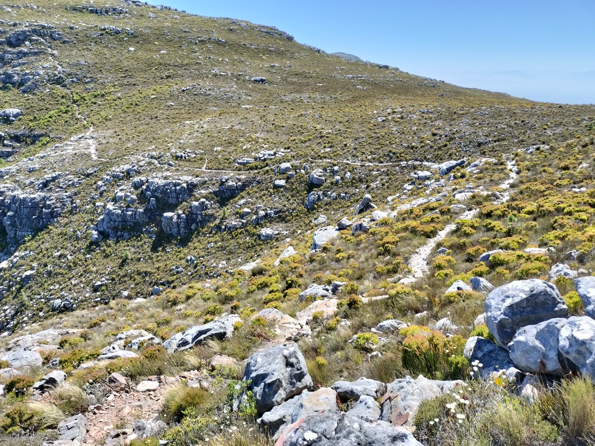 前述した女性グループのほか、小学生くらいの子ども連れファミリーや、杖を突きながら歩く年配のグループも見かけました。しかし、メインルートだとイーグルズ・ネスト・ルックアウトからは海が見えない道を通ることになります。そこで、欲張りな私は地図で見た「スカイライン・パス(Skyline Path)」を通って少し遠回りをして、また別の眺望スポット「ノールトフック・ピーク・ベンチ(Noordhoek Peak Bench)」を目指すことにしました。