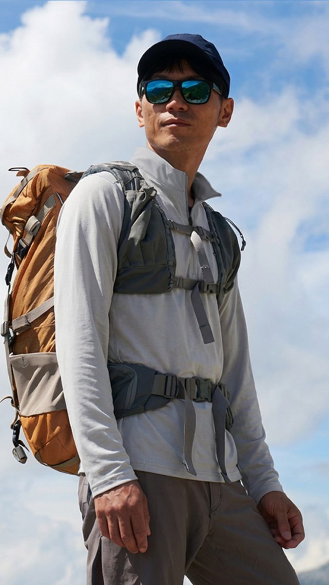 遮熱性能を活かすため、ファイントラックのL2シリーズでは唯一となるフルジップパーカーを採用。フードで頭部まで日差しをカバーしつつ、状況に応じて素早く開閉できる。