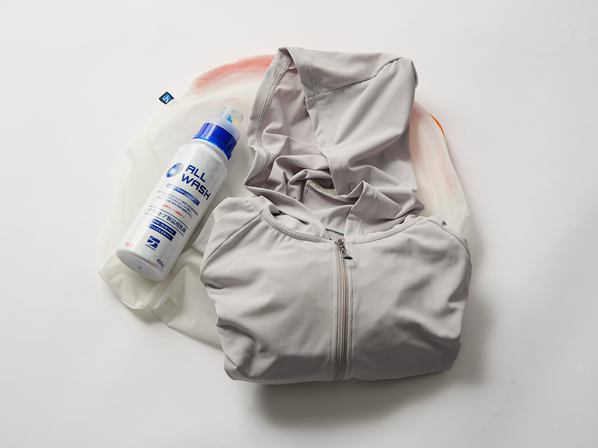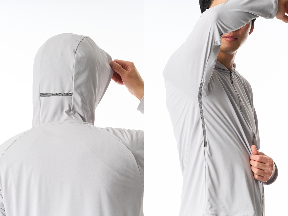 さらに脇下とフード裏には通気メッシュを配置。衣服内の熱気を外へ逃がし、風の通り道をつくることで蒸れを軽減する。