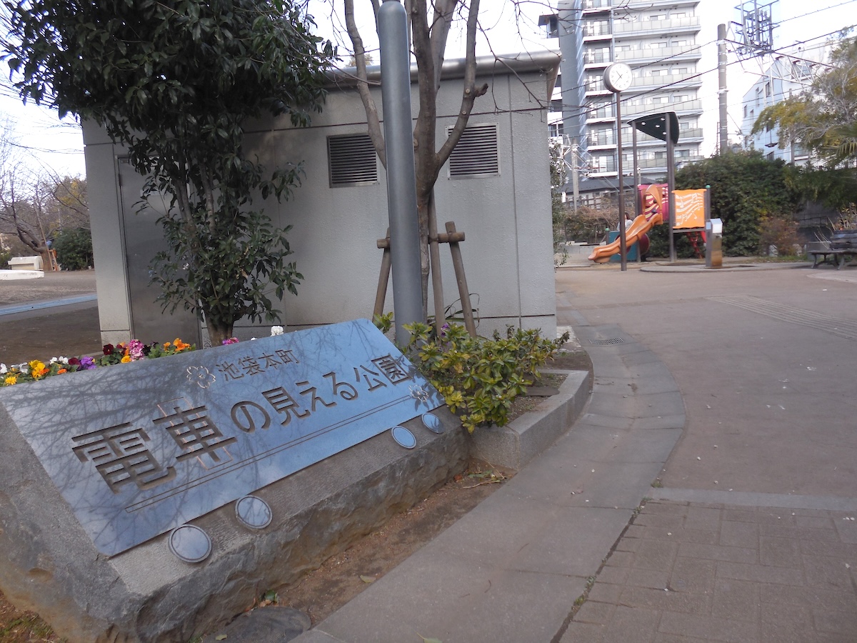 下板橋駅前の近くまで来ると、緑道なのか一般的な歩道なのか区別がつかなくなりました。それでも街路樹が続く通りを進んでいくと、下板橋駅の先に「池袋本町電車の見える公園」がありました。その名の通り、すぐそばを東武東上線が通っています。