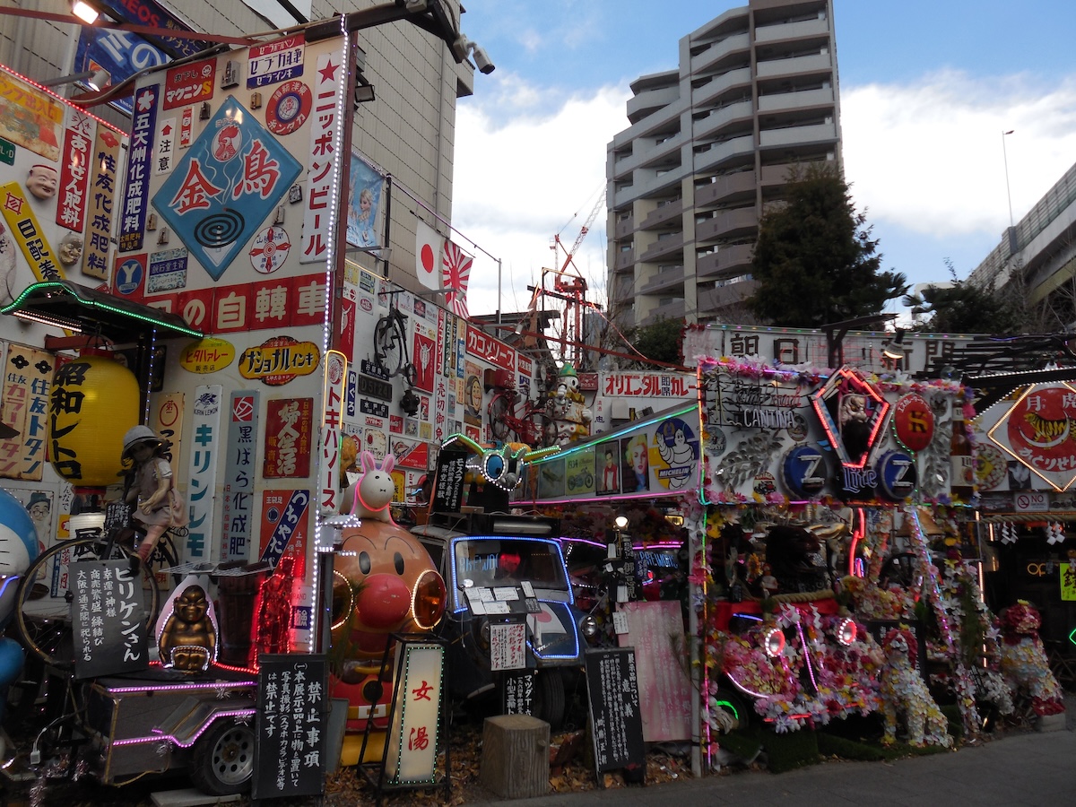 気になったので調べたところ、こちらは「熊野町交差点レトロ空間」という名称で、所有者は「池袋の不動産王」ともいわれた加藤正衛さんという方だと分かりました。テレビなどでもたびたび取り上げられているそうです。ここは交通事故の多い交差点だったらしいので、やたら目立つコレクションには注意喚起などの意味合いも込められているのかもしれません。