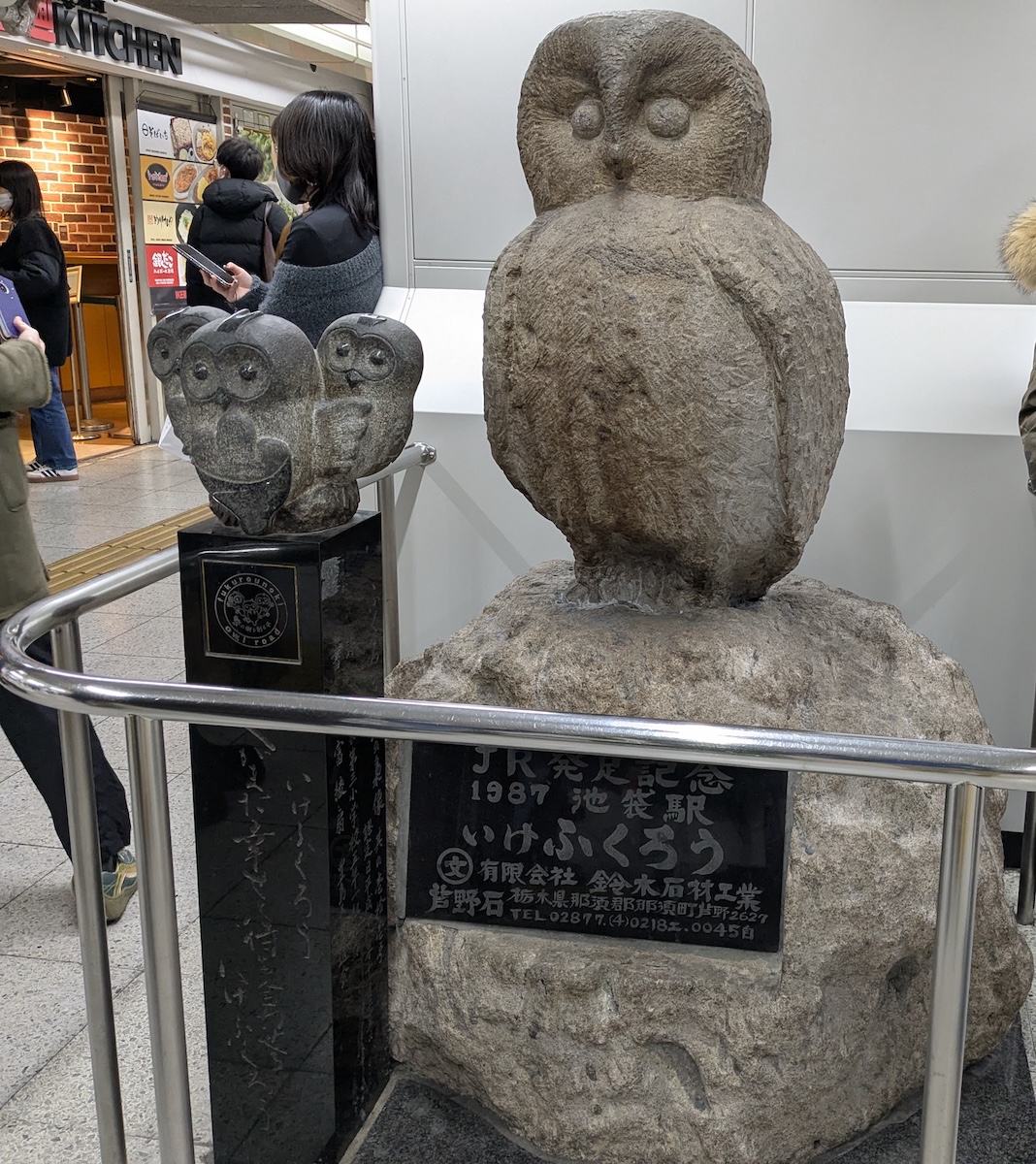 池袋周辺にはフクロウの石像や壁画などが点在しています。「いけふくろう」という語呂合わせだけでなく、豊島区の形が羽を広げたフクロウの姿に似ていることなども関係しているそうです。