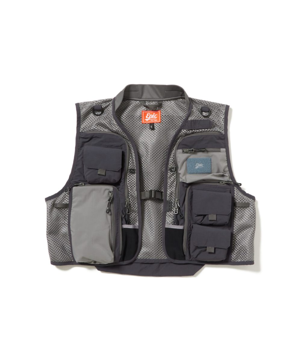 胸には大型ストリーマーフライボックスを設置し、ドライフライ、ウェットフライ、止水や本流、湖、ソルトウォーター、源流など幅広いジャンルのフィッシングに対応できる。ティペットやリーダーの収納、小物やフライ用ドレッシングの管理もスムーズに行える、収納力と機能性を備えたベストとなっている。