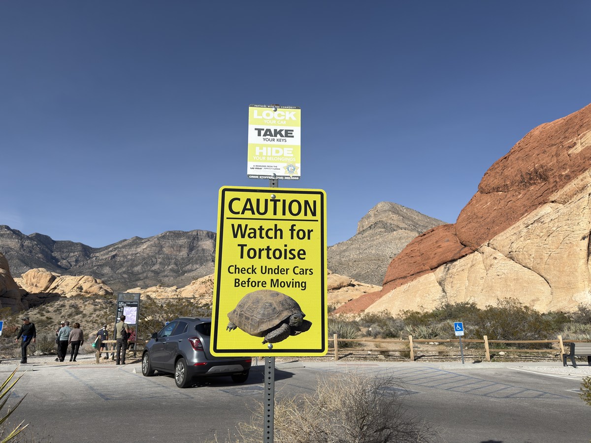 この地域には保護対象のリクガメが生息しているそうです。暑い日には、車の下の日陰に入り込むこともあるため、こうした注意書きが立てられているのだとか。砂漠ならではの動物の暮らしを想像しながら歩くと、景色の見え方も少し変わってきますね。