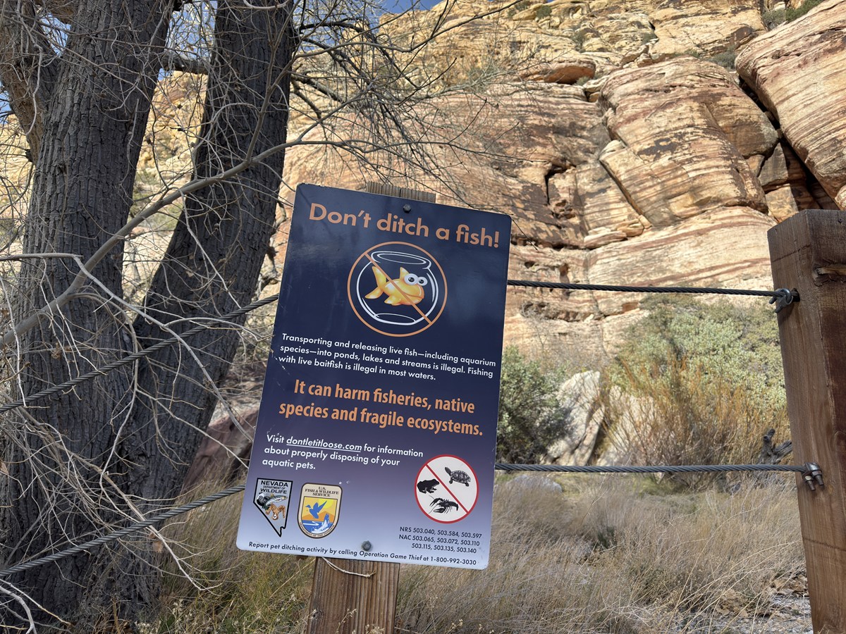 園内を進んでいると、目に入るのがさまざまなサインです。地形や岩の成り立ちを説明するものはもちろん、「リクガメ横断注意」の標識や、さらには「魚を捨てないで」という注意書きまであります。思わず立ち止まって読みたくなるものが多く、歩きながら小さな発見が続きます。