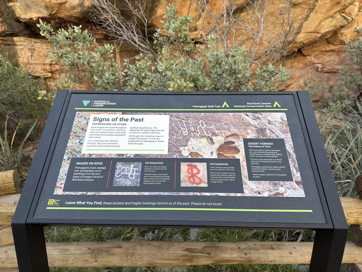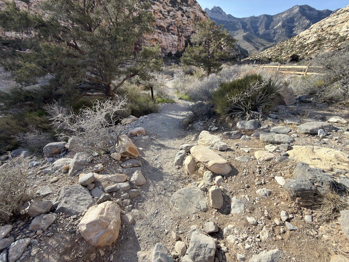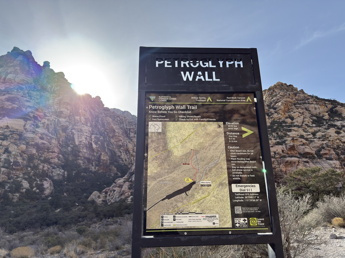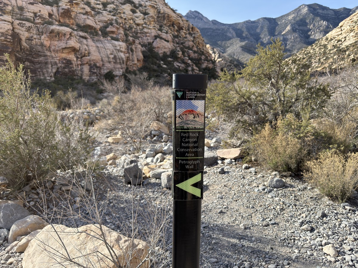 レッドロックキャニオンには、難易度や距離の異なるトレイルが25ほどあります。どこを歩こうか少し迷いましたが、今回選んだのは岩絵を見ることができる道。砂岩の間を歩きながら、静かな砂漠の時間を感じる30分ほどのショートコースです。
