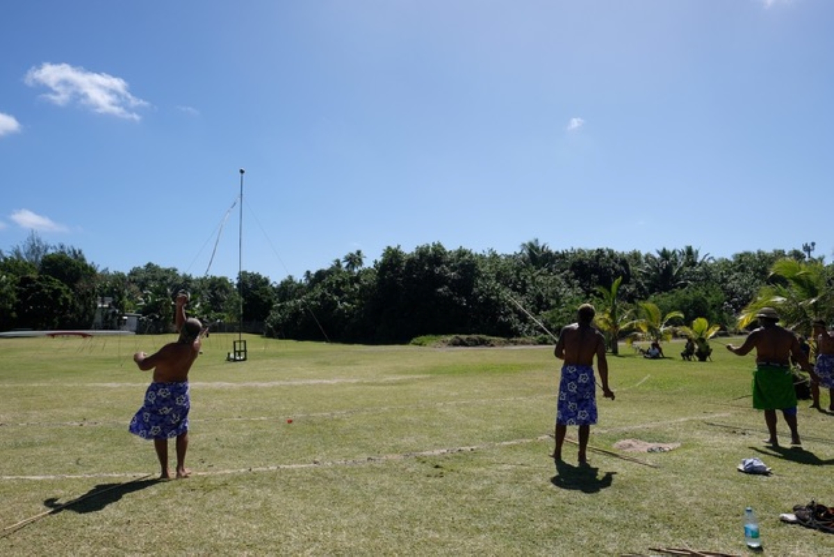 チーム戦の槍投げ競技。頭上10メートルの位置に設置されたココナッツを、20メートル以上も離れた場所から木製の槍で射抜くというもの。