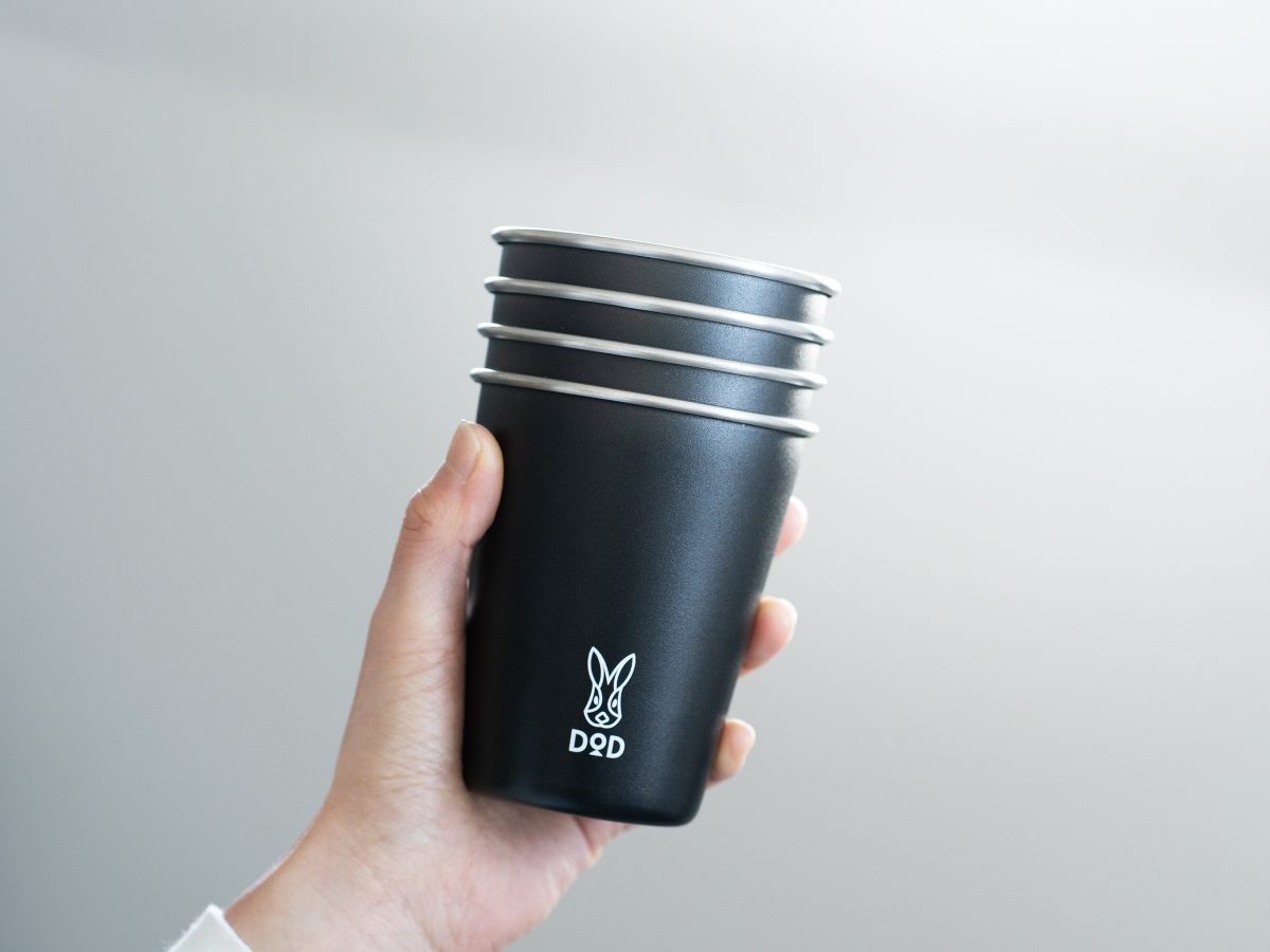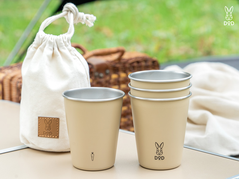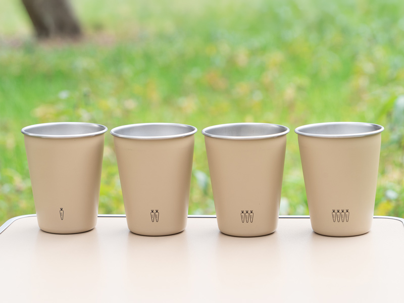 「ヨッツスタック・ウサカップ」はウサギロゴがカワイイ4個セットのステンレスマグ。コップによって“にんじんの本数”が異なるので、「自分のコップどれだっけ?」という場面でも目印になる。