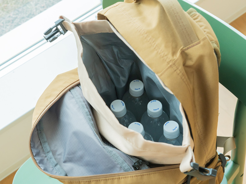 「ヒヤウィーゴークーラー(6)」は厚さがわずか約12cmのインナークーラーバッグ。ソフト素材を活かした設計により、500mlペットボトルが5本も入る収容力で、40℃の猛暑でも8時間氷をキープする断熱性能を装備している。付属のストラップを使えば単体でも持ち運ぶことが可能だ。