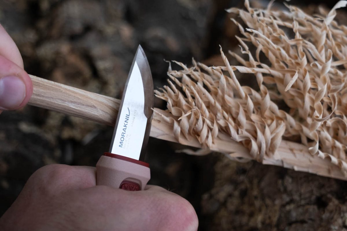 ブレードは厚みが2段階に設計されていて、先端では食材のカットなど繊細な作業を、刃元ではフェザースティック作りやロープカットといった力のかかる作業をこなすことができる。