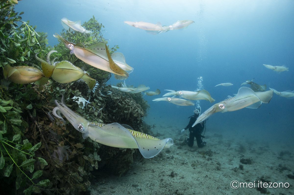 海底でじっと息を潜めていると、やがて遠くから、アオリイカたちが次々に姿を現します。