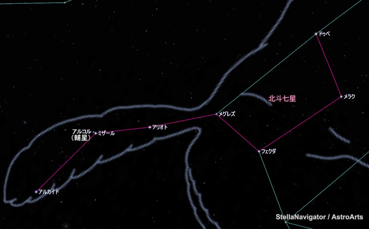 漫画『北斗の拳』には「死兆星」という星が登場します。この星が見えたら死が近い……という不吉な星でした。中国の古い星図では「輔星」(ほせい)という名で記されている実在の星です。現在の恒星名「アルコル」のことだと考えられます。上の図のミザールの連星、見えれば視力のよさの証明になるような小さな星です。