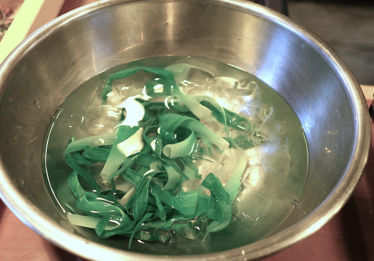 ヤブカンゾウとノビルは、さっと茹がいて氷水に取る。ヤブカンゾウもノビルの葉も、緑が一段と鮮やかに冴える。ヤブカンゾウはきれいに切り揃えて、またノビルの球根も丁寧に洗って、下拵えは完了。これを小鯛ささ漬とともに、酢味噌で和えて饅膾(読み「ぬたなます」)にする。天盛りには、タネツケバナの花をあしらった。まさに色よし、味よし、香りよし。吉次さんが「摘み草のよろこびは、萱草(読み「かんぞう」」)に代表されると言ってよいほどです」と絶賛しているように、舌触りがよく、甘く、またほのかな苦味もある。添えられたノビルの球根は、ネギより味も香りも濃いために、いいアクセントになっている。