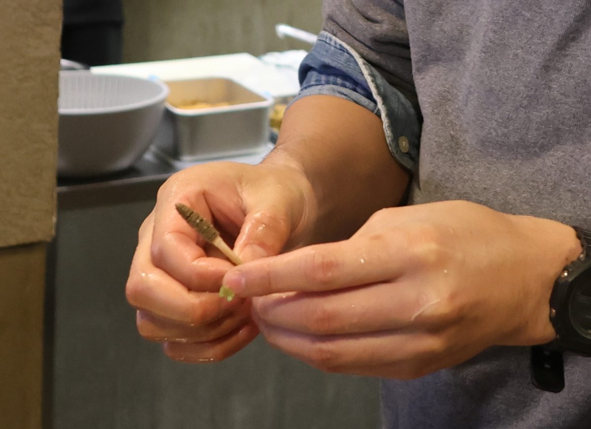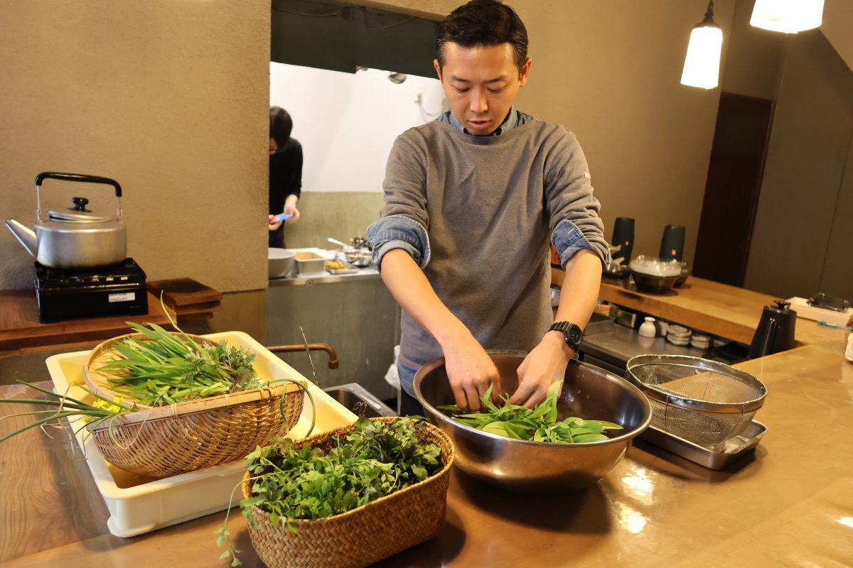 大原で摘み草をするときから、篤志さんはなるべく枯れ草や土を現場で落とすように、また同じ種類の植物をきちんと揃えるように丁寧に扱っていた。これは持ち帰ったあと、料理の下処理を楽にするためである。キッチンに戻って、ヤブカンゾウ、セリ、ノビル、タネツケバナ、つくしなどをきれいに洗っていく。次に、つくしの袴を剥がしていく。つくしを折らないように、あまり力を入れずに丁寧に袴を取っていく。「慈しんで取り扱うのも、滋味の一つ」とは、篤志さんの伯父にあたる京都・花背「美山荘」の三代目・中東吉次さんの著書にある。
