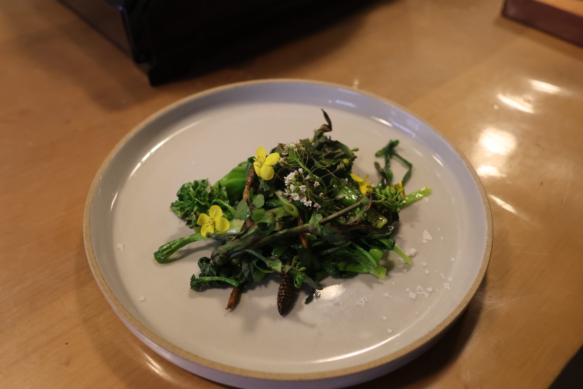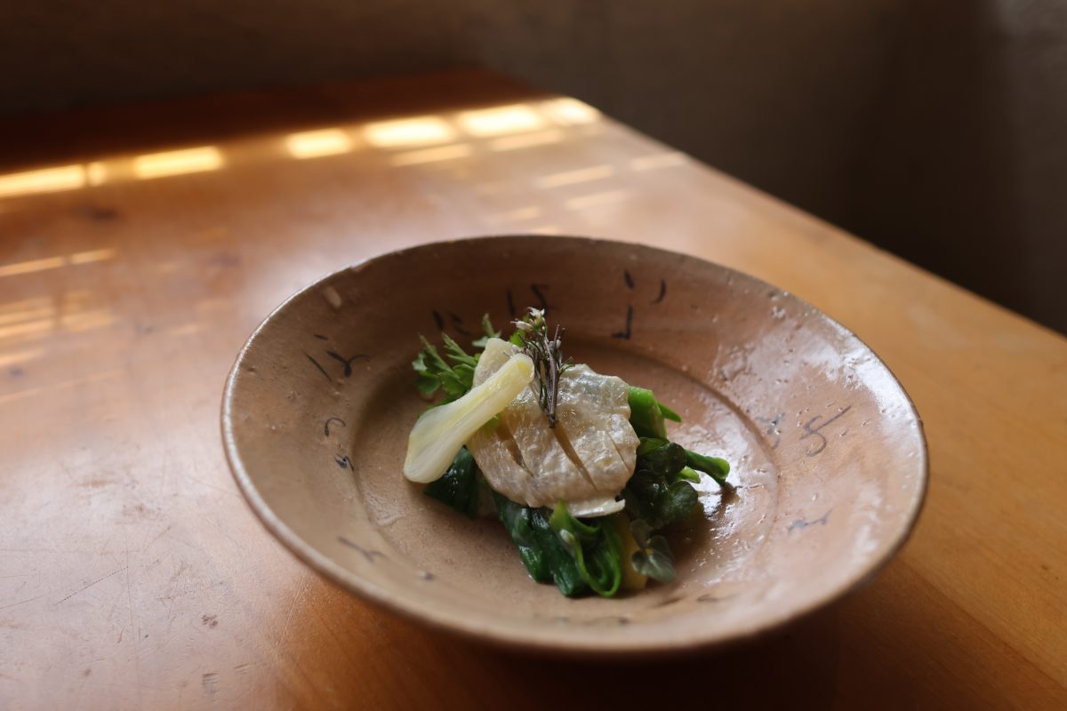 ヤブカンゾウ、ノビル、クレソン、つくし、京水菜の花茎と、1種類ずつ別々に丁寧に焼いていく。これらの焼いた摘み草を盛り合わせたあと、タネツケバナと京水菜の花を天盛りにして、塩を一振りしていただく。それぞれの香りや苦味の違いを味わうことができる、春を感じさせる料理になった。