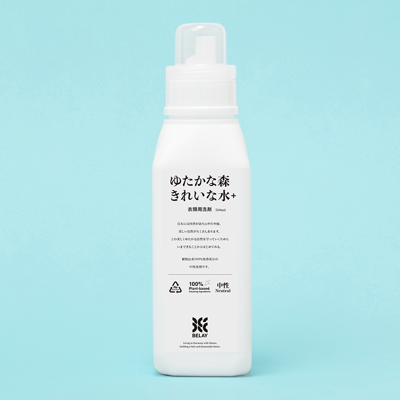 その思想を体現する「ゆたかな森きれいな水+」は、BELAYとゴールドウインが約2年にわたり改良を重ねて開発されたアウトドア衣類用洗剤。泥汚れから皮脂汚れまで幅広く対応する洗浄力を備えている。