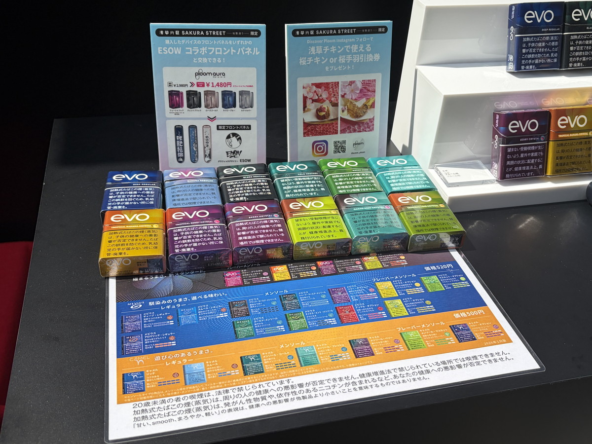 ラウンジ内では、Ploom専用たばこスティック「EVO」の新銘柄「エボ・サクラ・レギュラー」を含む全銘柄のテイスティングや加熱式たばこ用デバイス「Ploom AURA」のデバイス販売も行っています。