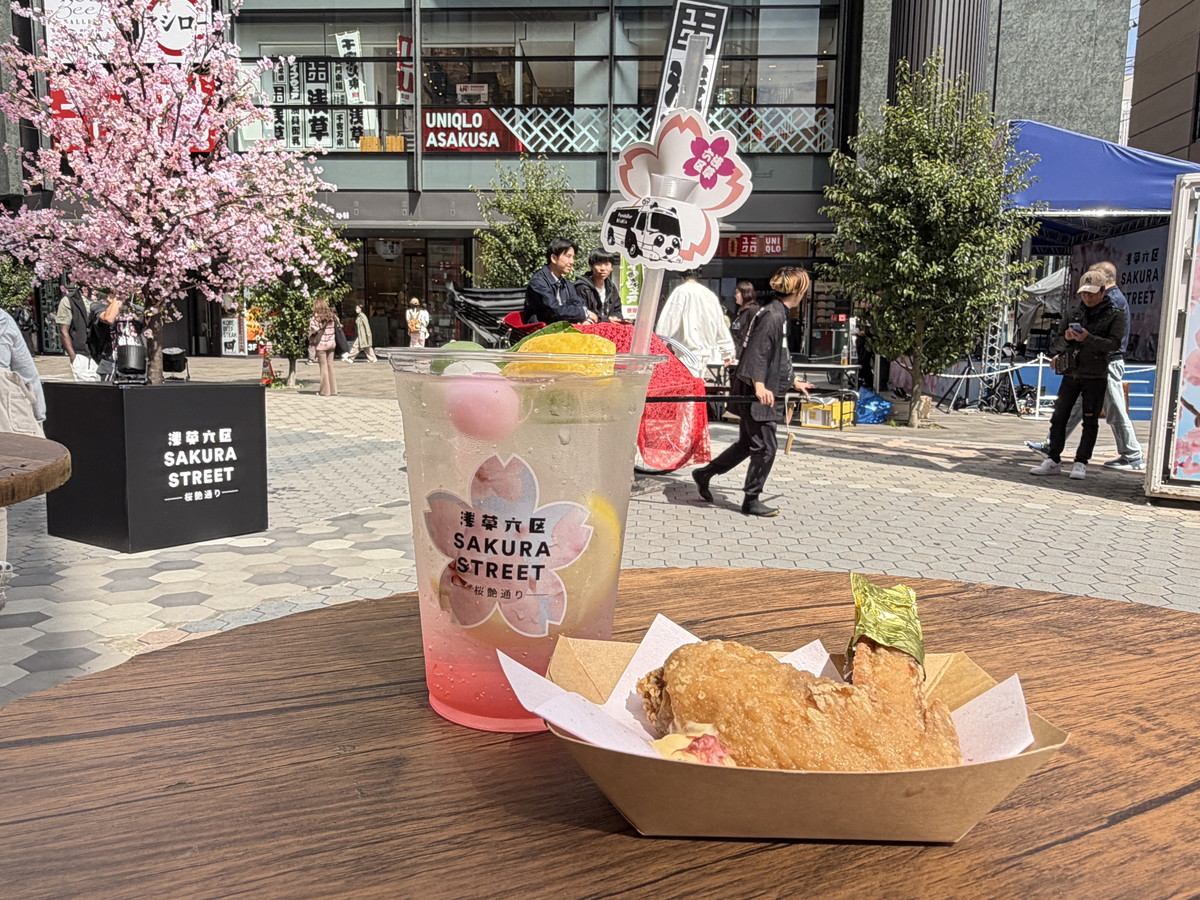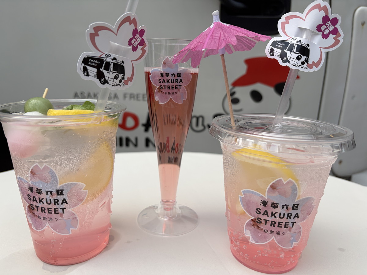 「ドン・キホーテ浅草店」前の「Panda Bar NinNin」には、「桜レモンサワー」「桜ロゼ」「さくらソーダ」の3種類の桜ドリンクを用意。「まるごとにっぽん」の前には、「浅草チキン」が「桜チキン」「桜手羽」やチキン入りおむすびなど3種がセットになった「お花見三色チキン」を販売しています。