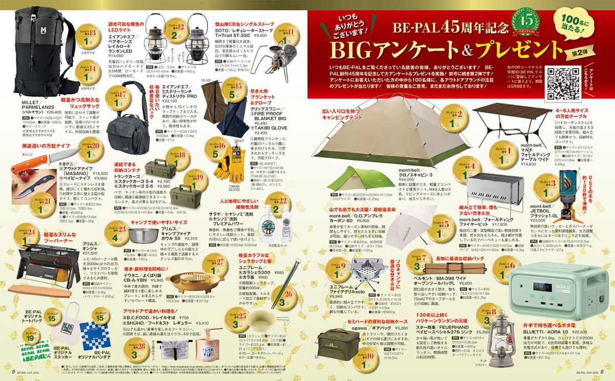 大好評第二弾! 創刊45周年を記念して大アンケート&プレゼントを実施いたします。各メーカーさまからご協力いただいた豪華アウトドアギアを、アンケートにお答えいただいた方、100名様にプレゼント! 奮ってご応募ください。