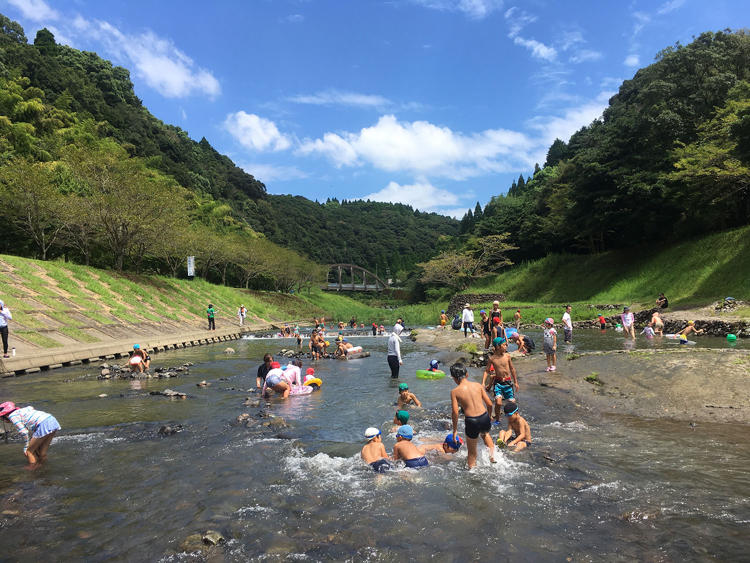 敷地内を万之瀬川(まのせがわ)が流れていて、夏には川の流れを利用した自然のプールが登場します。水中眼鏡で自然観察ができるエリア、小さなお子さんも安心して遊べる浅瀬エリア、ペットと一緒に遊べるエリア、カヌーが遊べるエリアなどに分かれているので安心。ウォータースライダーもあるなど、思い思いの水遊びが満喫できます。常設サイトにはピルツが設営されており快適。宿泊棟はロッジとケビンの2タイプです。