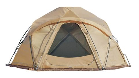 ダブルクロスポールで広く安定した空間を確保し、ワイドドアでテントにもタープにも使える万能幕。TC素材で通気性・結露耐性も高い。さらに広く快適な後継モデル「シェルターGHE」も登場。