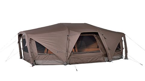 空気を入れるだけでアウターフライシートが立ち上がり、設営が簡単。ファミリー向けの大型シェルター。