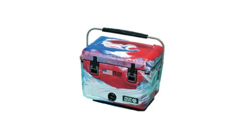 断熱材は5cm以上の厚みで、最大10日の氷保冷力を誇る。350ml缶を39本分収納可能。蓋には型押しのフィッシングメジャー付き。角の2か所に栓抜きも備えられている。