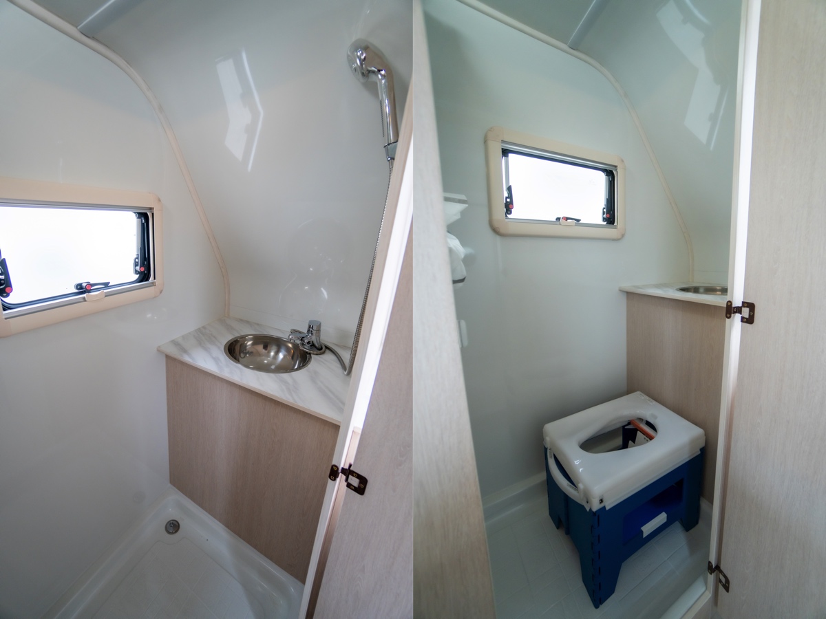 サニタリールームにはシャワー付き洗面台が標準装備され、オプションでラップ式ポータブルトイレの設置も可能。床がシャワーパンのため、濡れた道具などを置いておくこともできる。
