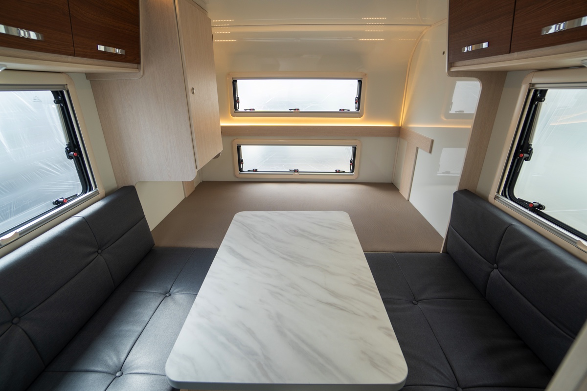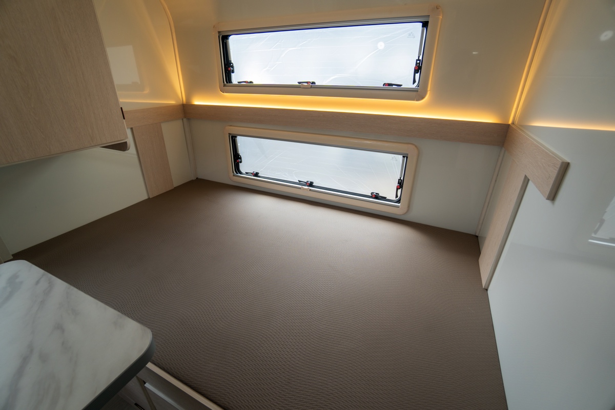 エントランスはフロント寄りで車両前方側にキッチンスペースとしており、ドアの正面にはサニタリールームも完備。上部収納棚やワードローブなども備わっていますが、張り出しが少ないためかエントランスから見ると車両後方はすべてリビング&ベッドスペースになっており、驚くほど開放的。中央のリビングは横座り二の字ソファによる対面タイプで、最後部には常設ダブルベッドというレイアウト。