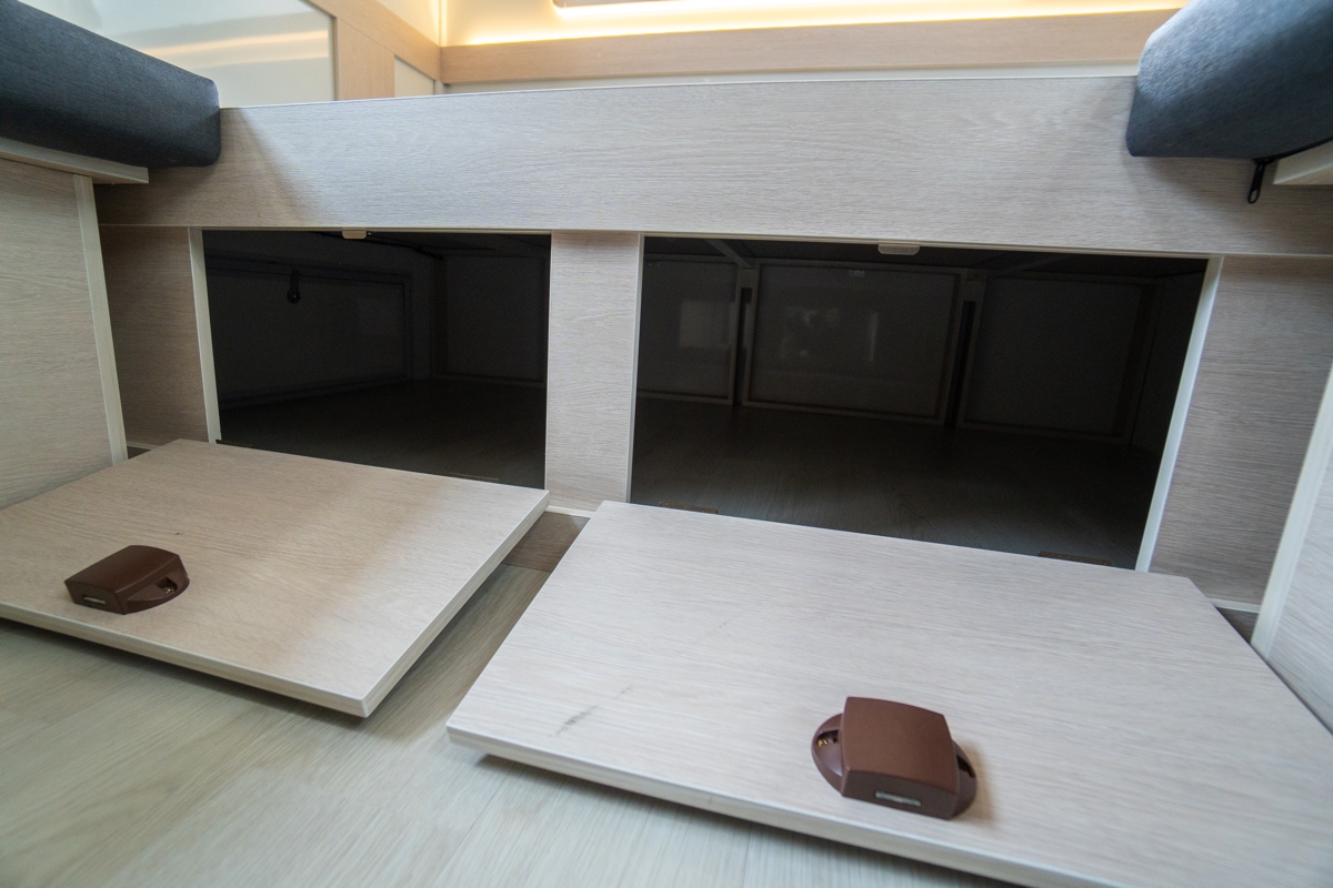 上部収納棚に加え、ソファやベッド下などにも収納スペースがあるので長期旅の荷物もたっぷり入る。