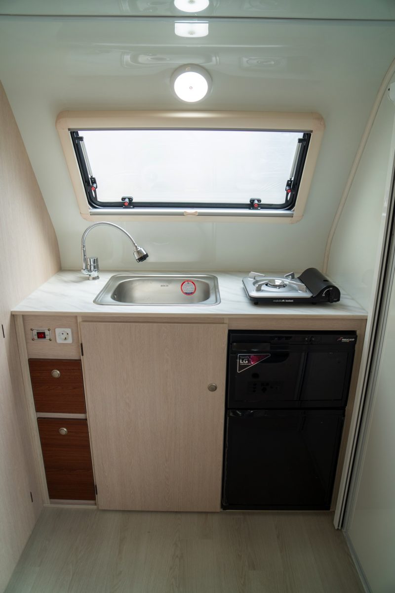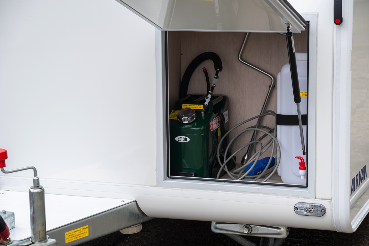 また、車内で使用するガスについてもプロパンではなく、カセットガス供給器を採用しておりコンビニなどでも手に入れやすいカセットガス仕様になっています。水まわりは30Lの給水タンクに、15L排水タンクを搭載。サニタリールームにはシャワー付き洗面台も装備。