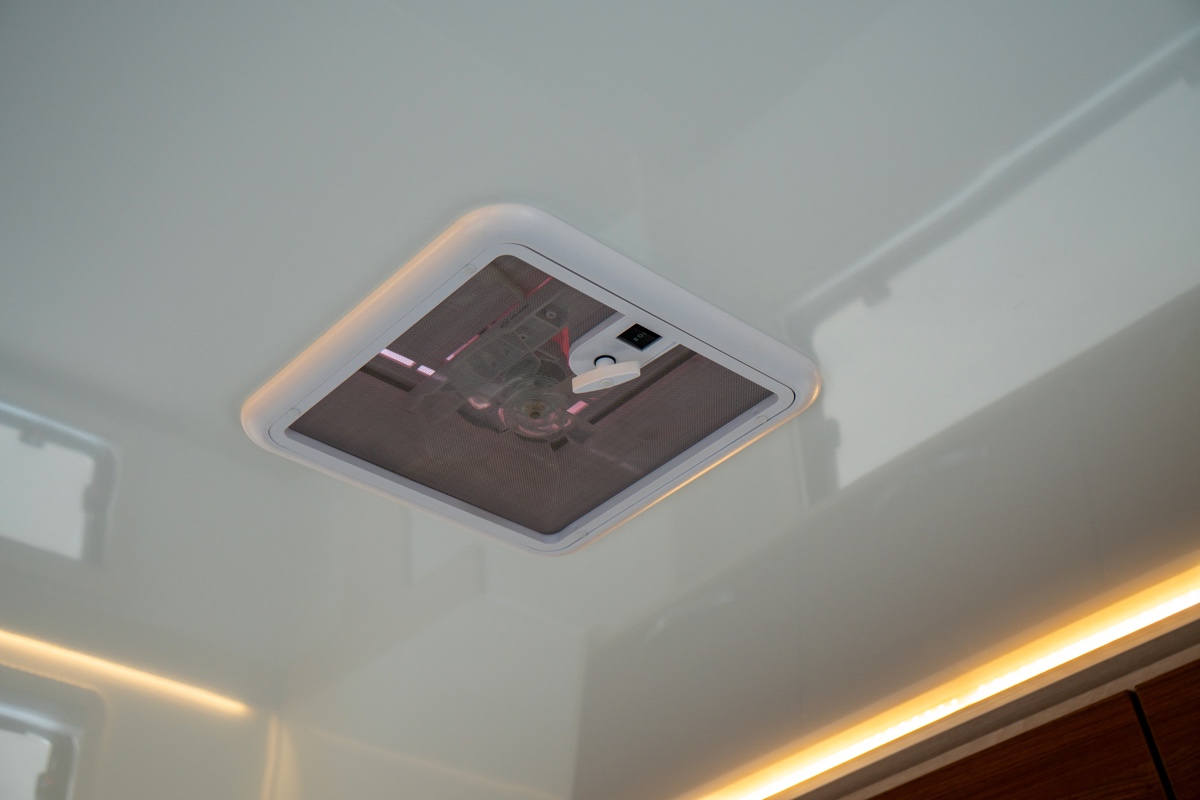 装備面を見てみると、シェル部分にはインディアナ・RVのこだわりでもあるXPSスタイロフォームを採用し、天井と壁には30mm、床に45mm厚の断熱材を使用しており、断熱はもちろん、強度や耐久性にもしっかり配慮。また、天井にはルーフベント(換気扇)も標準で装備。