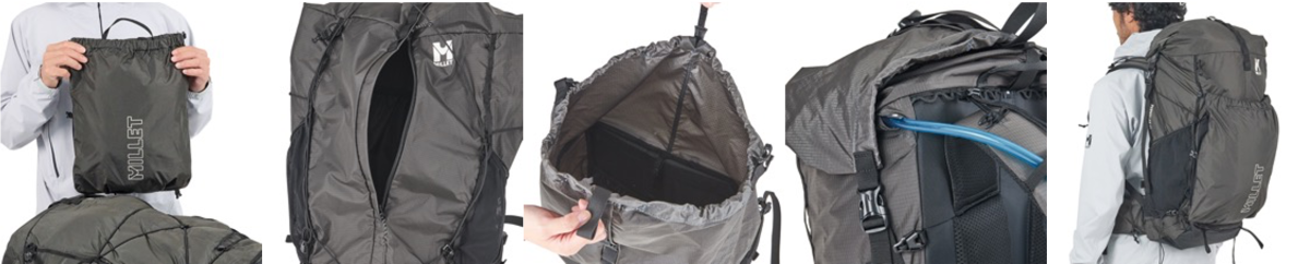 サイドオープンアクセスジッパーにより荷物の出し入れがしやすく、収納袋はインナー・外付けの両方に対応。ミニマルな設計で、ファストハイクやアタックザックとしての使用にもフィットする。