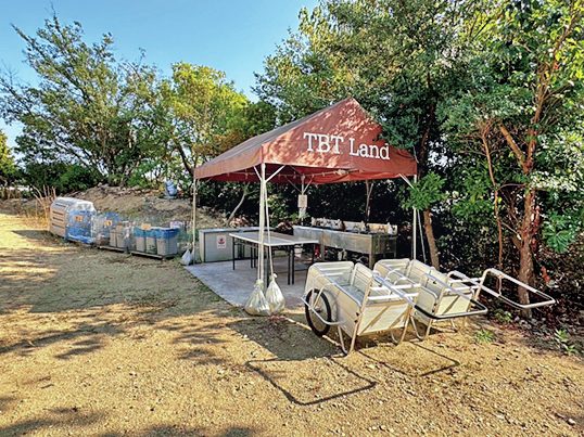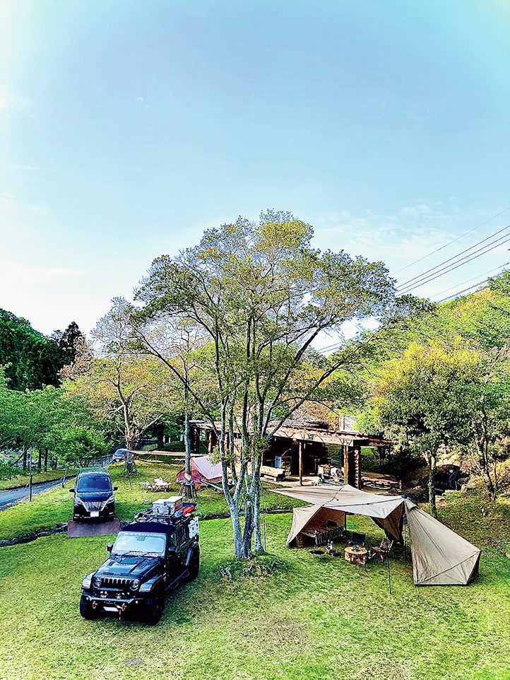 カメリア温泉に隣接する遊休施設に手を入れキャンプ場として再生。利用料金には薪代、食器・鍋類、フライパンやケトル、コンロ2台が含まれているうえに、各サイト専用のキッチン+冷蔵庫まである。寝泊まりはテントだが、別荘感覚で利用できる。