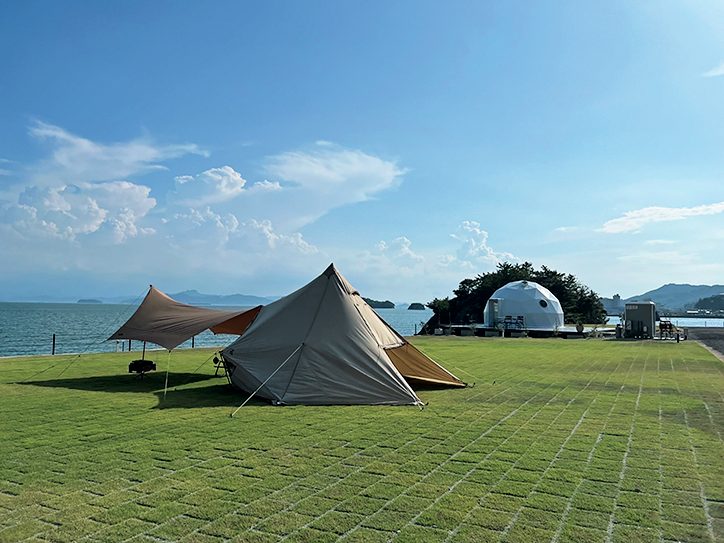 瀬戸内海に浮かぶ小豆島に誕生した施設。テントサイトはオートサイト、フリーサイト、キャンピングカーサイトの3タイプ。レンタル品が充実しビギナーも安心。海を一望できるグランピング施設では、天窓から星空を眺められ、特別感がある。