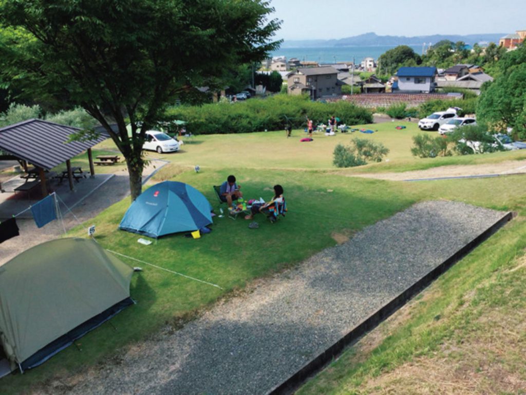 敷地面積約1.3ha。広々とした芝生が魅力の野営場。瀬戸内海を望む田の浦海岸もすぐそばで、海水浴客向けに水の出るシャワーもあり。すぐそばに標高82mの小山があり、山頂から播磨灘や引田の町なみが一望できる。「とにかく広く、開放感が魅力。無料の野営場にしては珍しく灰捨て場があるので、焚き火の後処理も楽ちんです」