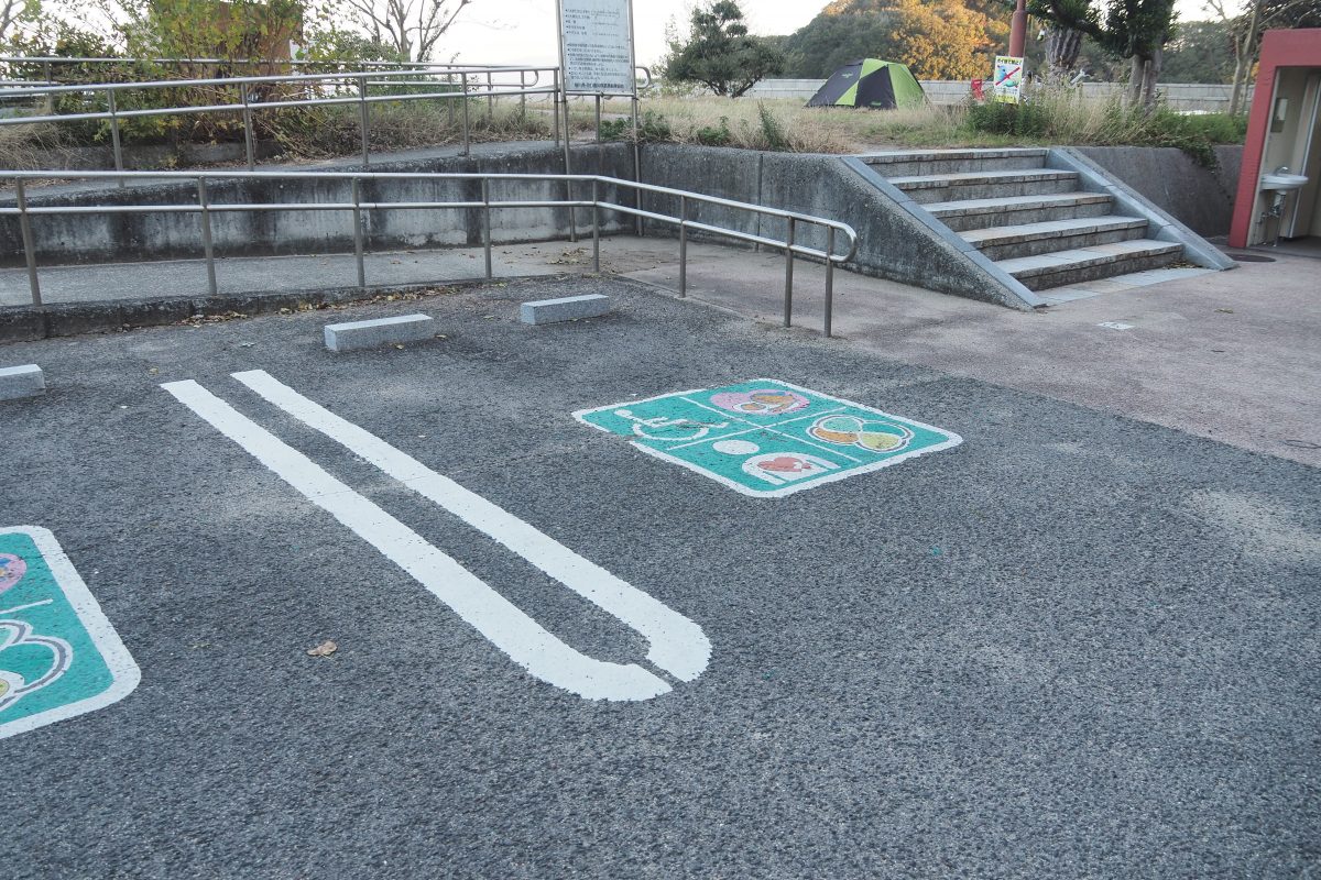 無料のスペースはスタッフがおらず、野営地から駐車スペースまで離れていることも珍しくなく、道具を運ぶのに一苦労ということがあるが、山田海岸は駐車場が目の前という好立地。