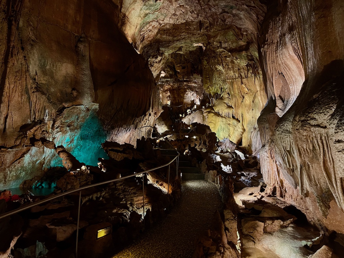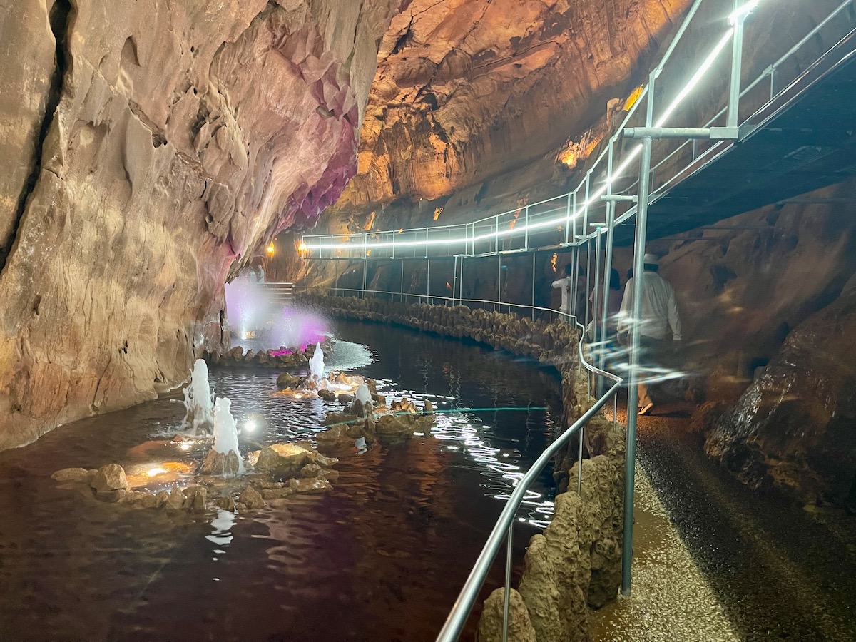 最後の湖には、なんとライトアップされた噴水が!地中の奥深くにいることを忘れさせるアミューズメントパーク感は、正直、少し残念な気もしました。けれども、実はこの噴水を使って、観光客の訪問によって乱される湿度など洞窟内の環境を最適化しているそうですよ。