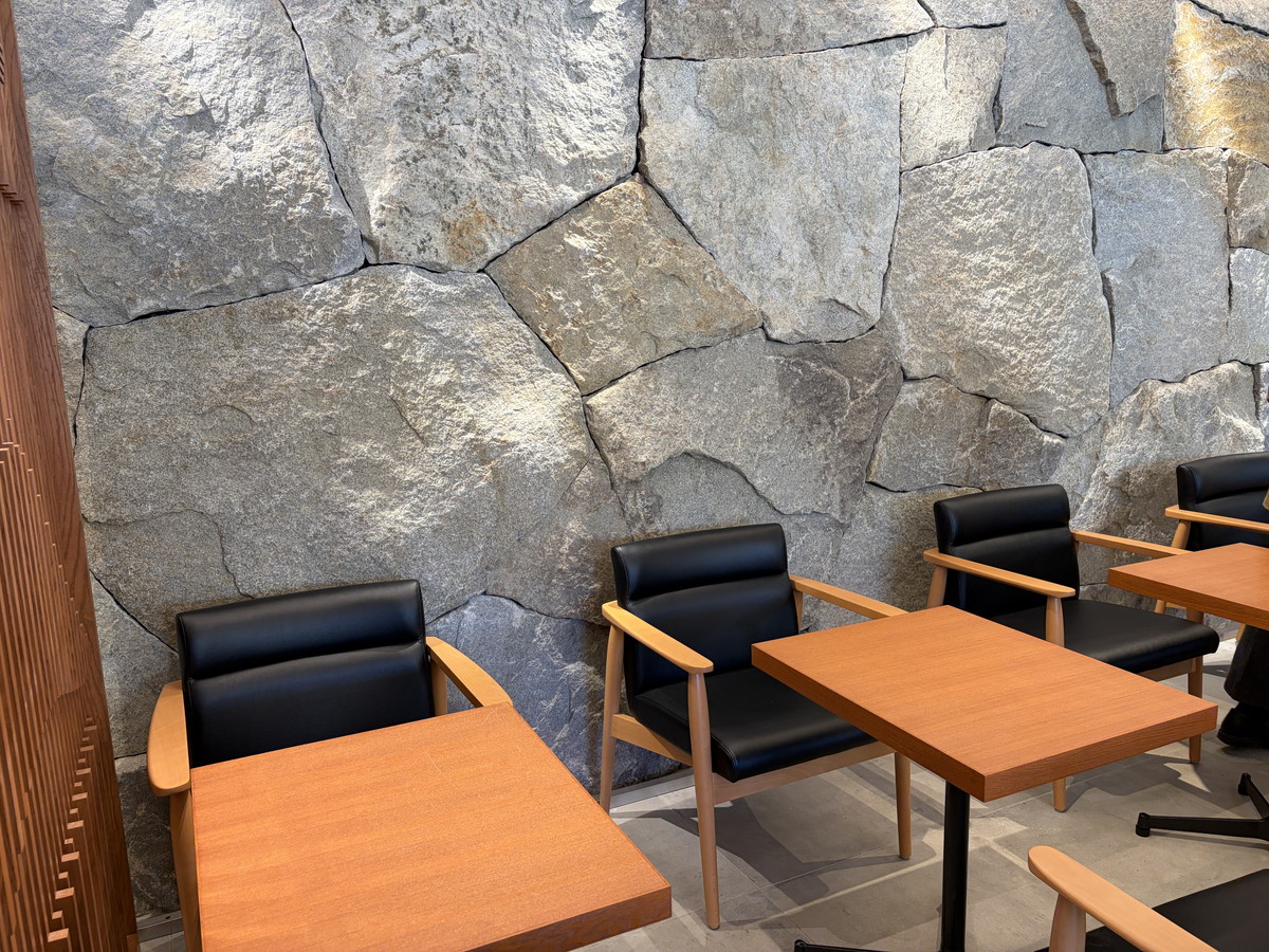 入り口のサインや店内の壁面には庵治石(あじいし)を使用。これは香川県高松市の五剣山で採掘される石で、世界最高品質を誇ることから「花崗岩のダイヤモンド」とも称されているもの。店内の壁は日本のお城の石垣のように美しく組み合わせられていて、自然の賜物とそれを仕上げる日本の技術者の匠の技を間近に見られます。