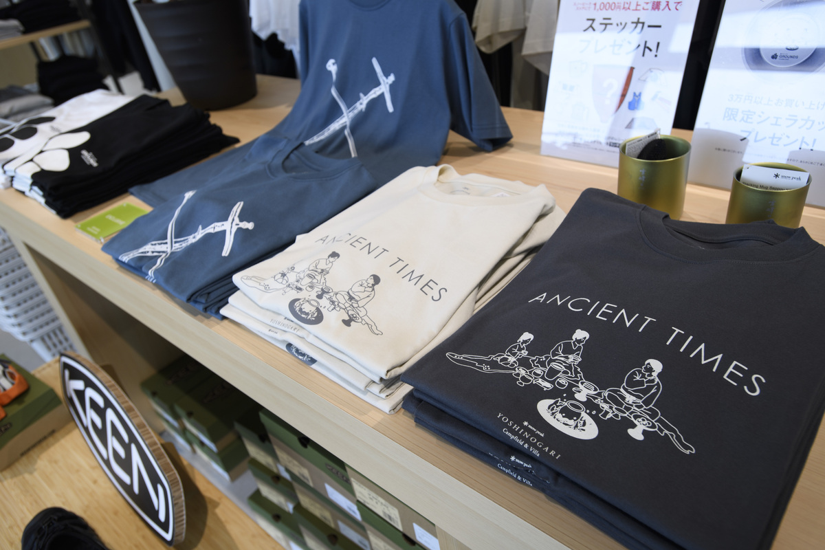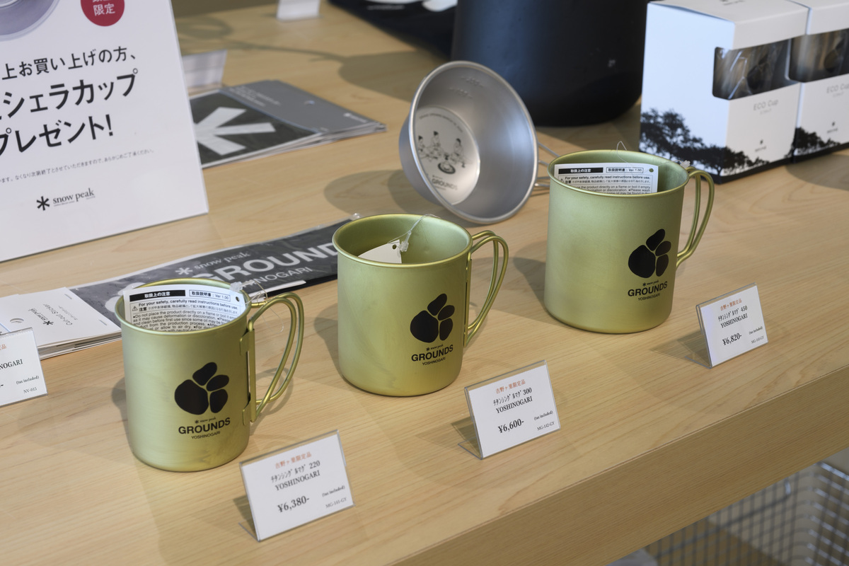 スノーピーク吉野ケ里店はどんな雰囲気なのか?他店との違いは?さっそく店内をまわってみると、定番のキャンプ用品はもちろんのこと、あちこちにオリジナルのロゴマークのついた、吉野ケ里店限定のアイテムが置かれているではないですか!通常、店舗のオリジナルアイテムは1、2点というが、こちらの店舗はマグカップ、Tシャツ、レインポンチョなどなど、アイテム数もバリエーションも多め。オンラインショップでは手に入らない限定品とのことで、ついつい財布のひもがゆるんでしまう(実際に、記者も取材後に、買い物タイムを満喫した)。