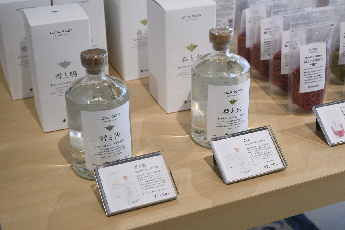 店舗内にはキャンプ用品以外に、地域の伝統工芸や地元企業とコラボレーションした佐賀県ならではの商品を豊富に取りそろえているのも特徴。地元の特産品を販売するコーナーが広くとられていて、クラフトジンやビール、尾崎人形など、スノーピークとコラボした限定のオリジナルアイテムや、佐賀海苔や嬉野茶などの特産品が数多く並んでいる。