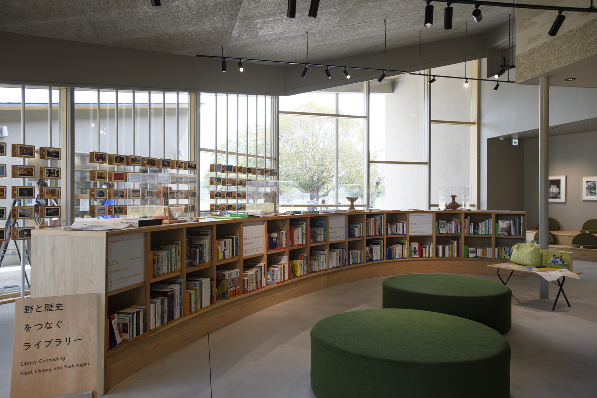 「歴史×地域×野遊び」をテーマに⼈と⼈がつながる交流拠点を開設。「野と歴史をつなぐライブラリー」はブックディレクターとして活躍する幅允孝(はばよしたか)⽒のプロデュースによるもので、蔵書のラインアップにも注目したい。ライブラリーにはまた、吉野ヶ⾥歴史公園やその周辺観光スポットを楽しめる情報カード「⾵⼟図鑑」も展⽰。より深く地域や歴史、野遊びを体感できる仕掛けも⽤意されているので、遺跡を見学する前にぜひ、訪れたい。