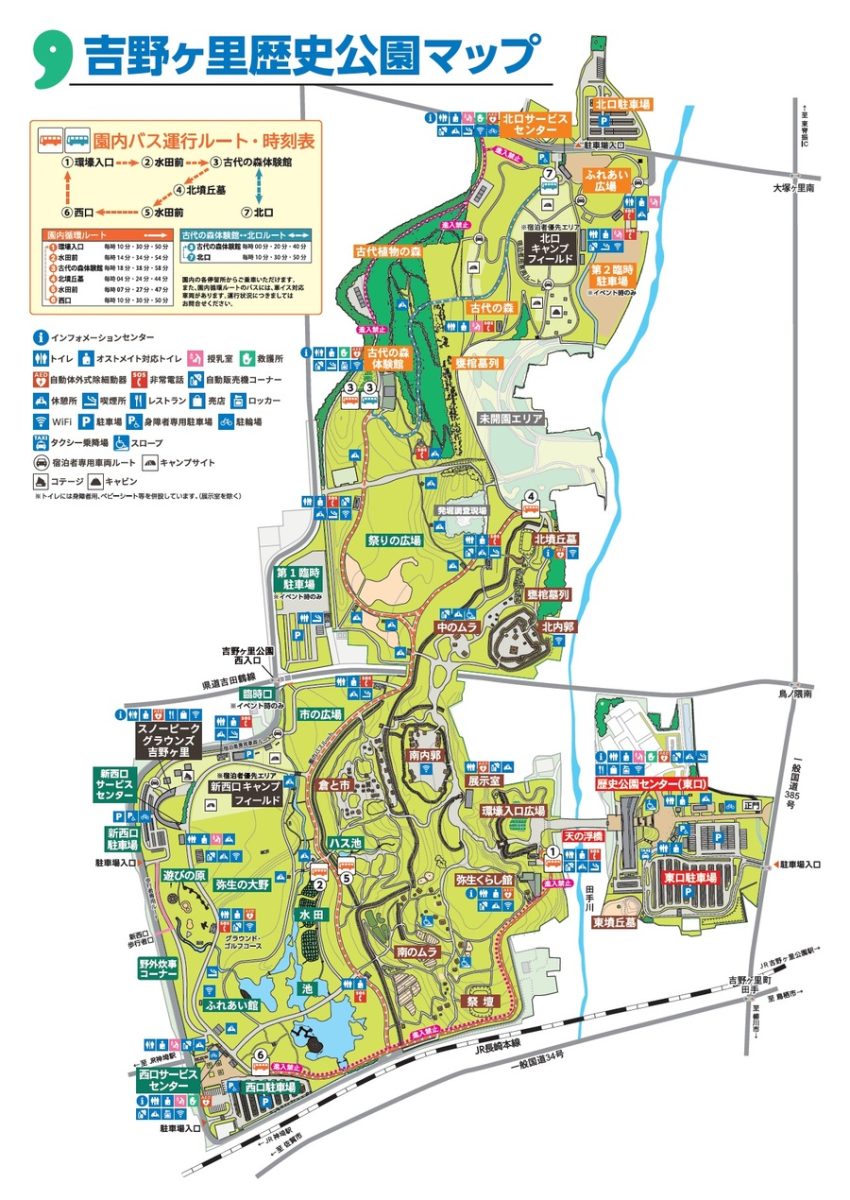 吉野ヶ里歴史公園は有料施設で、大人(15歳以上)』460円、大人2日通し券が500円、中学生以下は無料となっている。移動は徒歩のみだが、園内バスも運行している。公園のメインゲートとなる東口の歴史公園センターから入場すると代表的な復元遺跡へアクセスがしやすい。