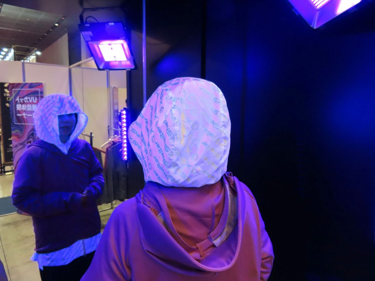 暑熱体験コーナーとUVカット機能体験コーナーがあり、まずは、すでに強くなっている紫外線に対して、どれくらいの対策ができるのかを体験しました。紫外線チェッカーがついた白いフーディーの上から、UVパーカーを着用しての体験です。紫外線が当たると、紫外線チェッカーが反応し、色が変化します。