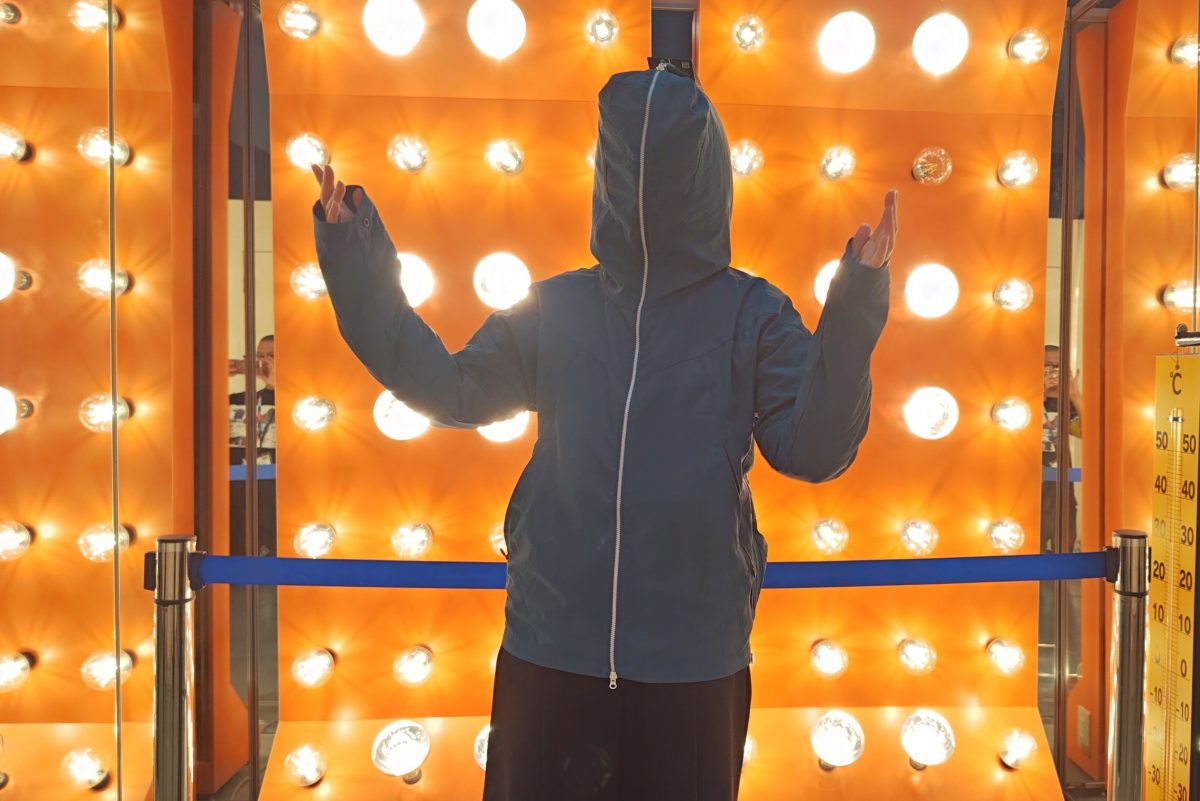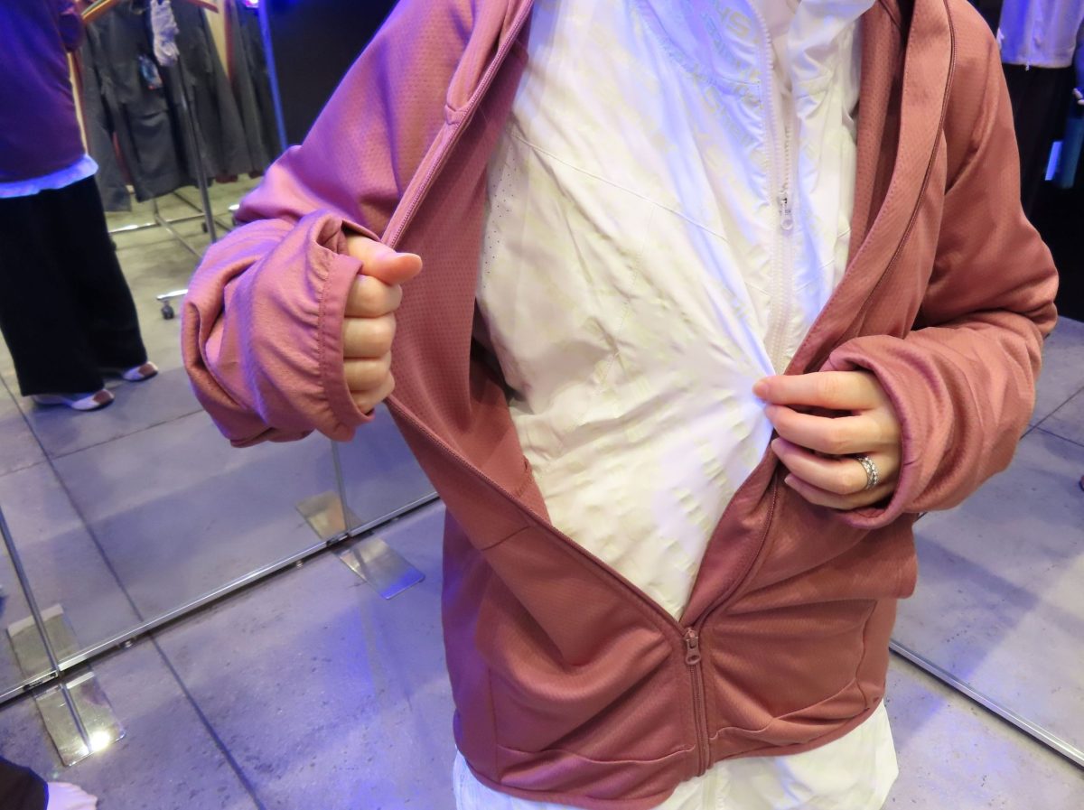 臨時ニュースで、会場のある地域が、気温45度を観測したという情報のもと、XShelterを着た人たちが、街の中で過ごすイメージが繰り広げられるなど、シーン別アイテムの提案もありました。ファンウエアの場合は、髪がなびくため、涼しそうに見えましたが、他のウエアは、見ているだけではその快適さはわかりません。ショーの後、実際に着用し、暑さや紫外線がどれくらい軽減されるのかを体験してきました。